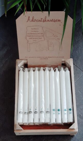 Advents Dinerkaarsen 20 sets met gratis houten display (verkoopprijs € 3,75 per stuk/ € 7,50 per set)