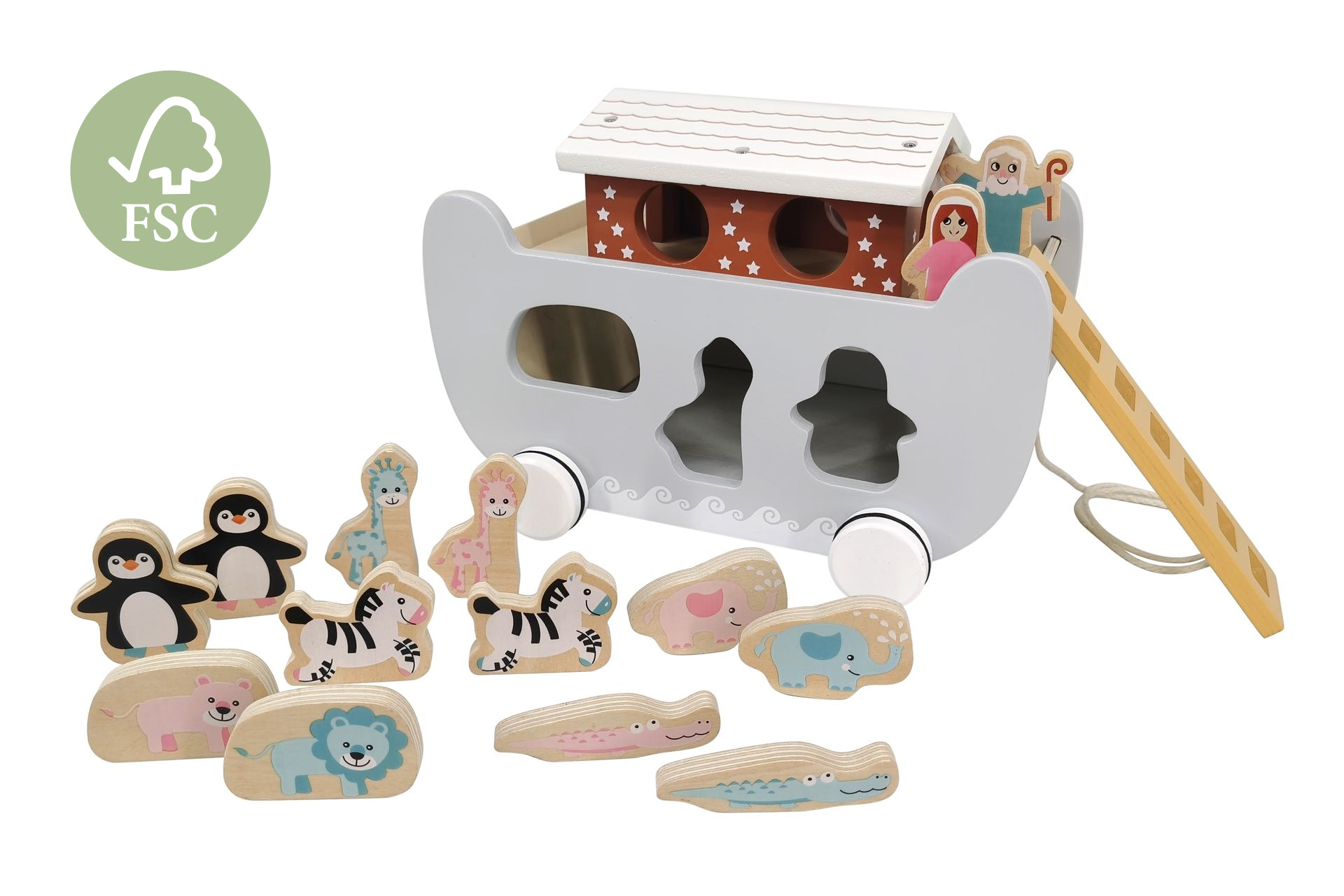 Met deze Ark van Noach kan uw kindje echt op reis: de ark heeft wielen en kan aan een touwtje vooruitgetrokken worden. Met Noach en zijn vrouw, 6 paar dieren en een ladder om aan boord te kunnen gaan.