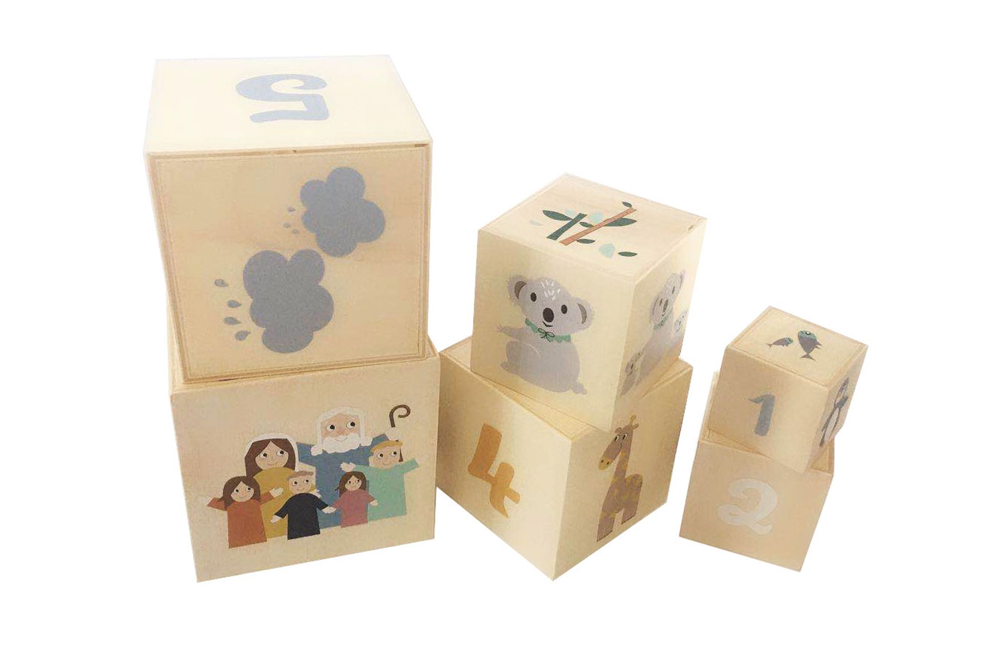 Stapel alle blokken in de goede volgorde op elkaar en zie Noach en zijn familie, alle dieren en cijfers op een rij!