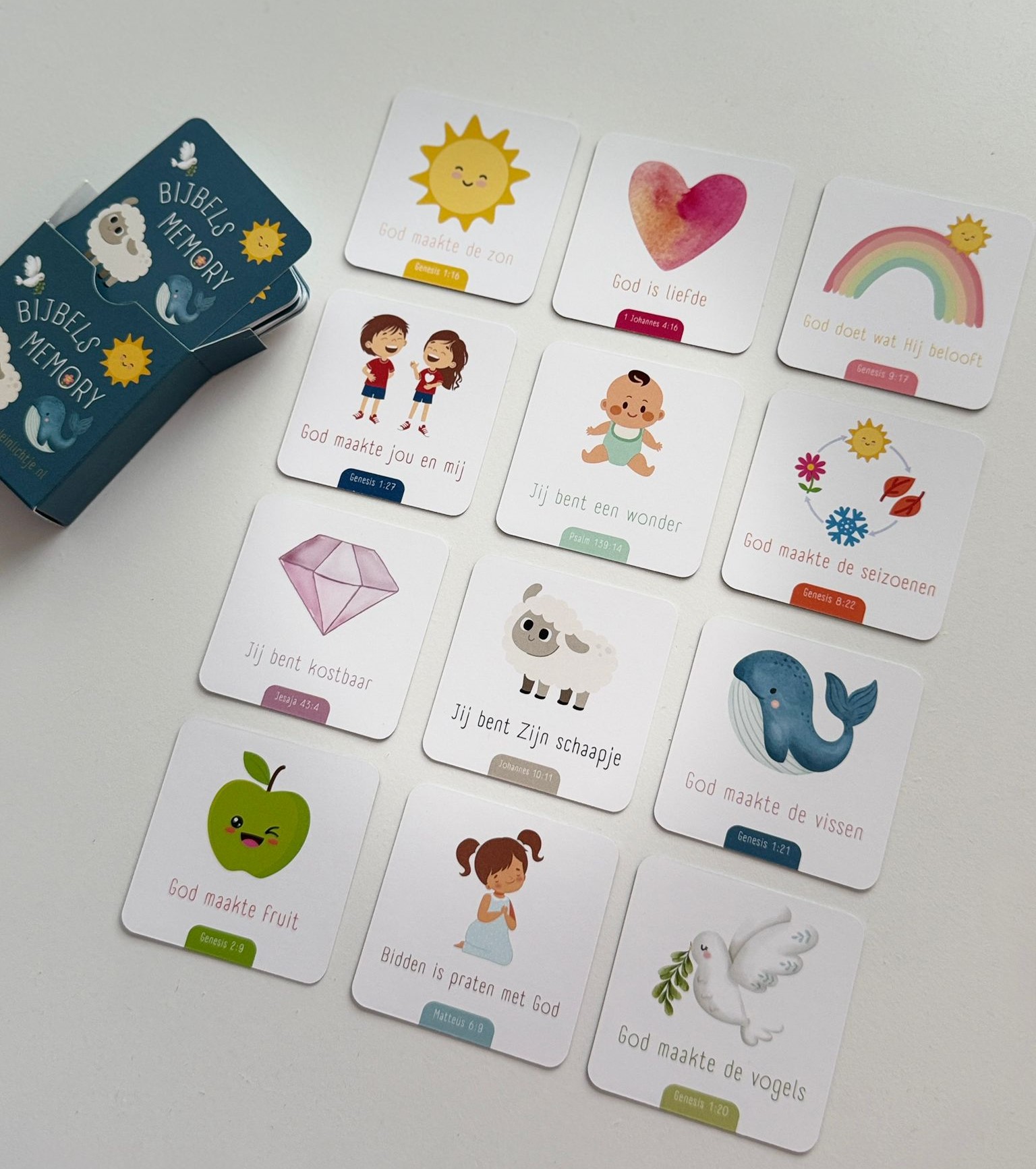Een prachtige bijbels memory. De memory bestaat uit 48 kaartjes geleverd in een bijpassend doosje zodat de kaartjes goed bewaard kunnen worden. Gegarandeerd uren speelplezier!