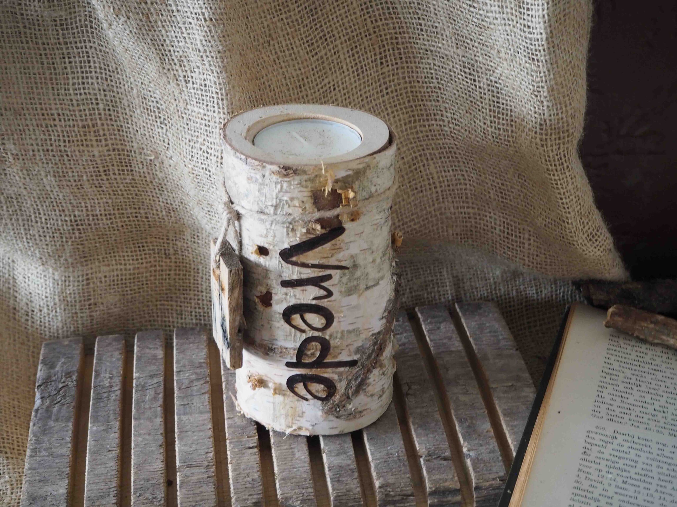 Boomstam M met gravure Vrede, met Kaars (vervangbaar)