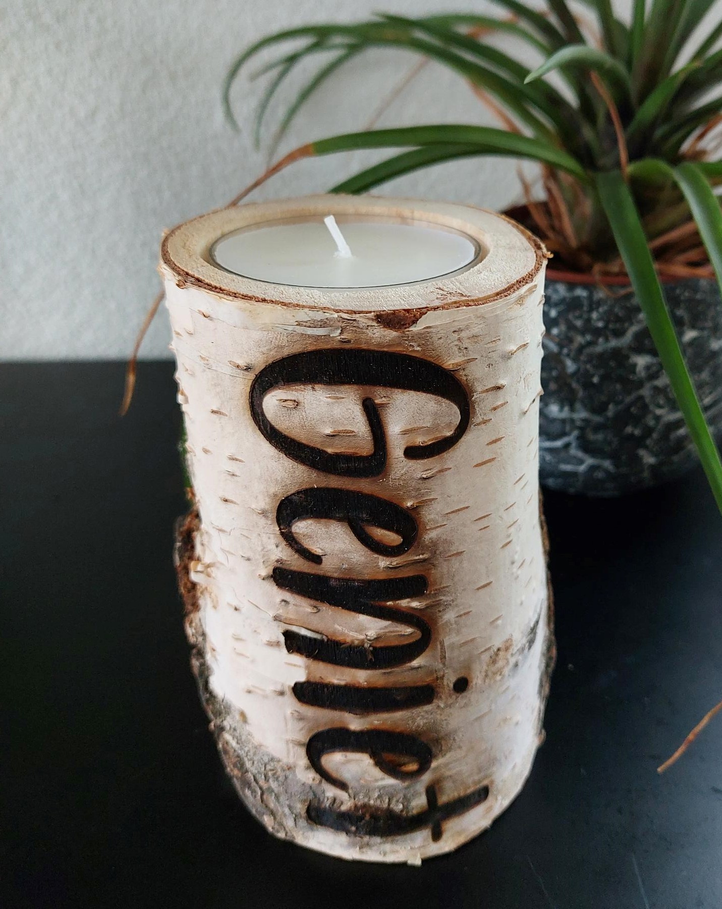 Boomstam Berk S, met gravure Geniet, met Kaars (vervangbaar). Dit artikel is wordt mede mogelijk gemaakt door mensen met een afstand tot de arbeidsmarkt.