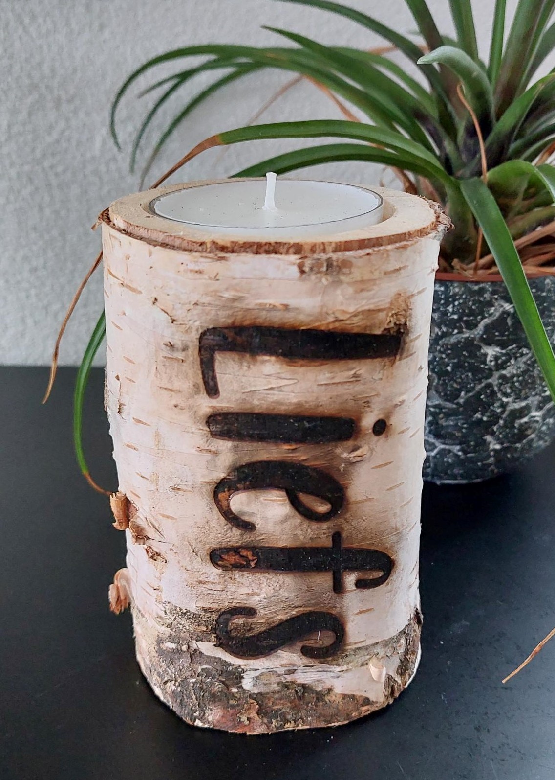 Boomstam Berk S, met gravure Liefs, met Kaars (vervangbaar). Dit product wordt mede mogelijk gemaakt door mensen met een afstand tot de arbeidsmarkt.