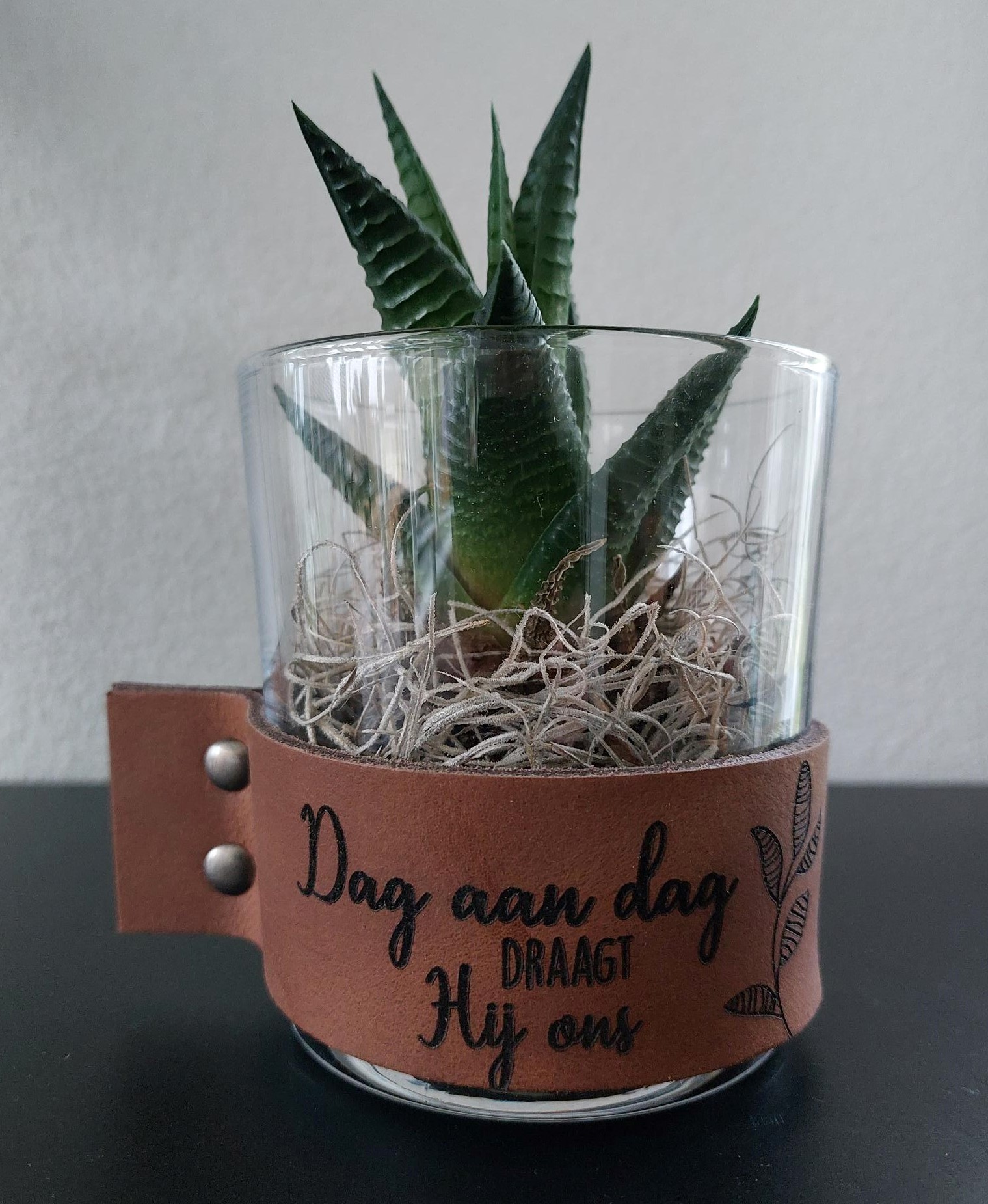 Cilinder Vaas met leerelement met tekst Dag aan dag draagt Hij ons. Mede gemaakt door mensen met een achterstand op de arbeidsmarkt. Deze vaas wordt geleverd exclusief inhoud.