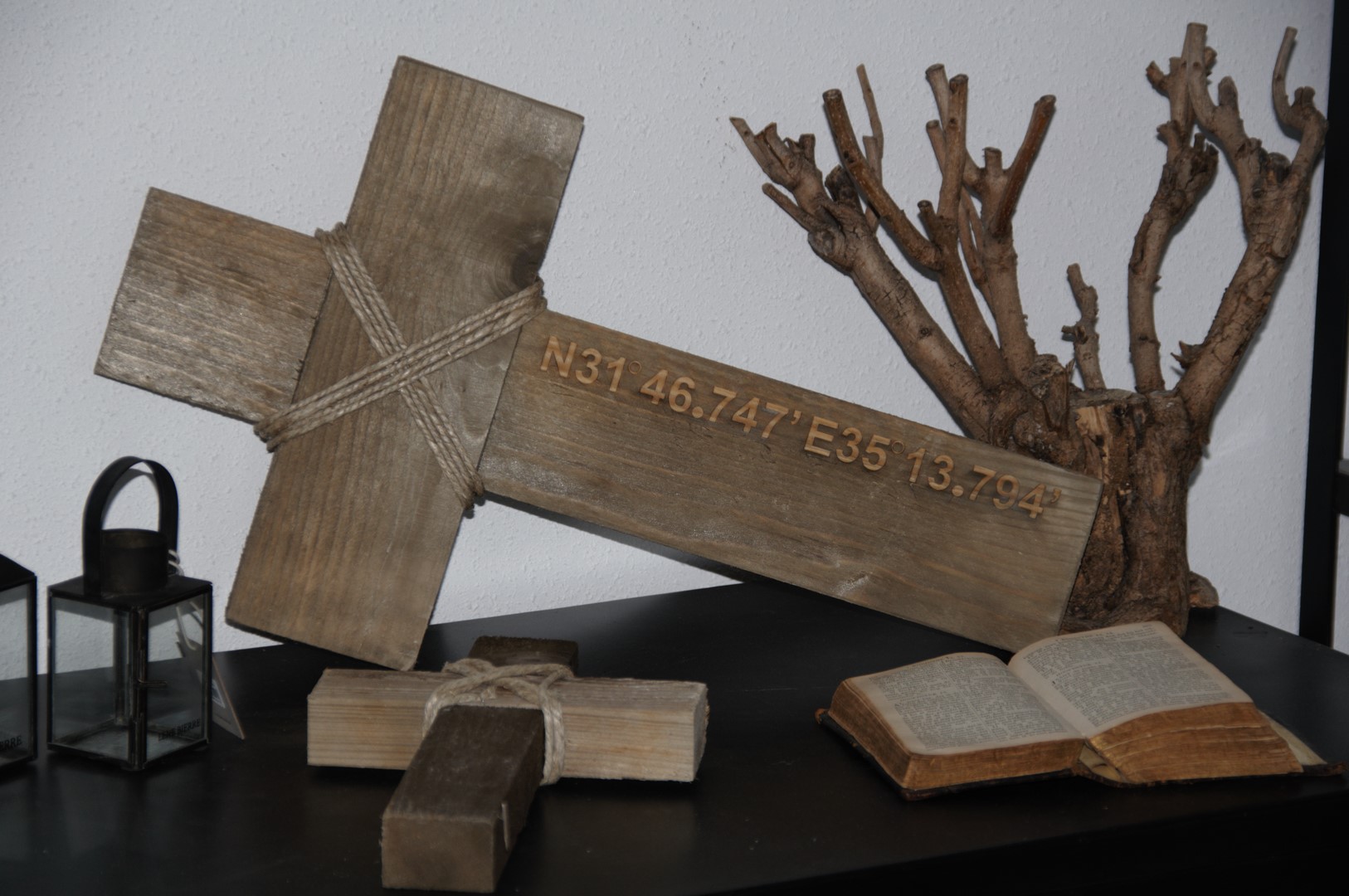 Een ruw, authentiek houten kruis als symbool voor het lijden van Christus. Op het kruis staan de gps-coördinaten (ingelaserd) van Gogoltha. Wanneer u deze coördinaten volgt komt u uit bij het kruis van Christus.