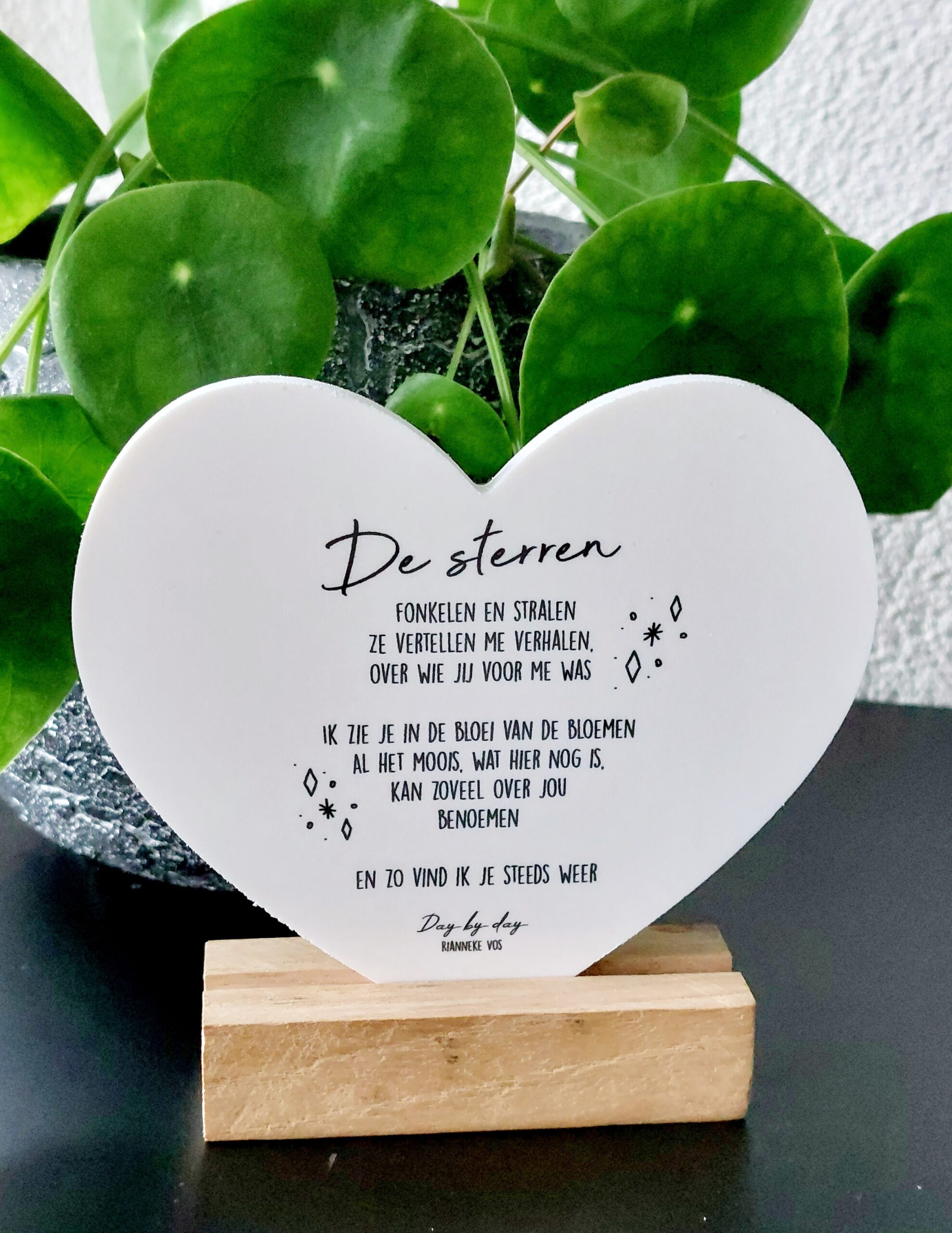 Geprint hart met mooie tekst. Dit hart wordt geleverd inclusief standaard.