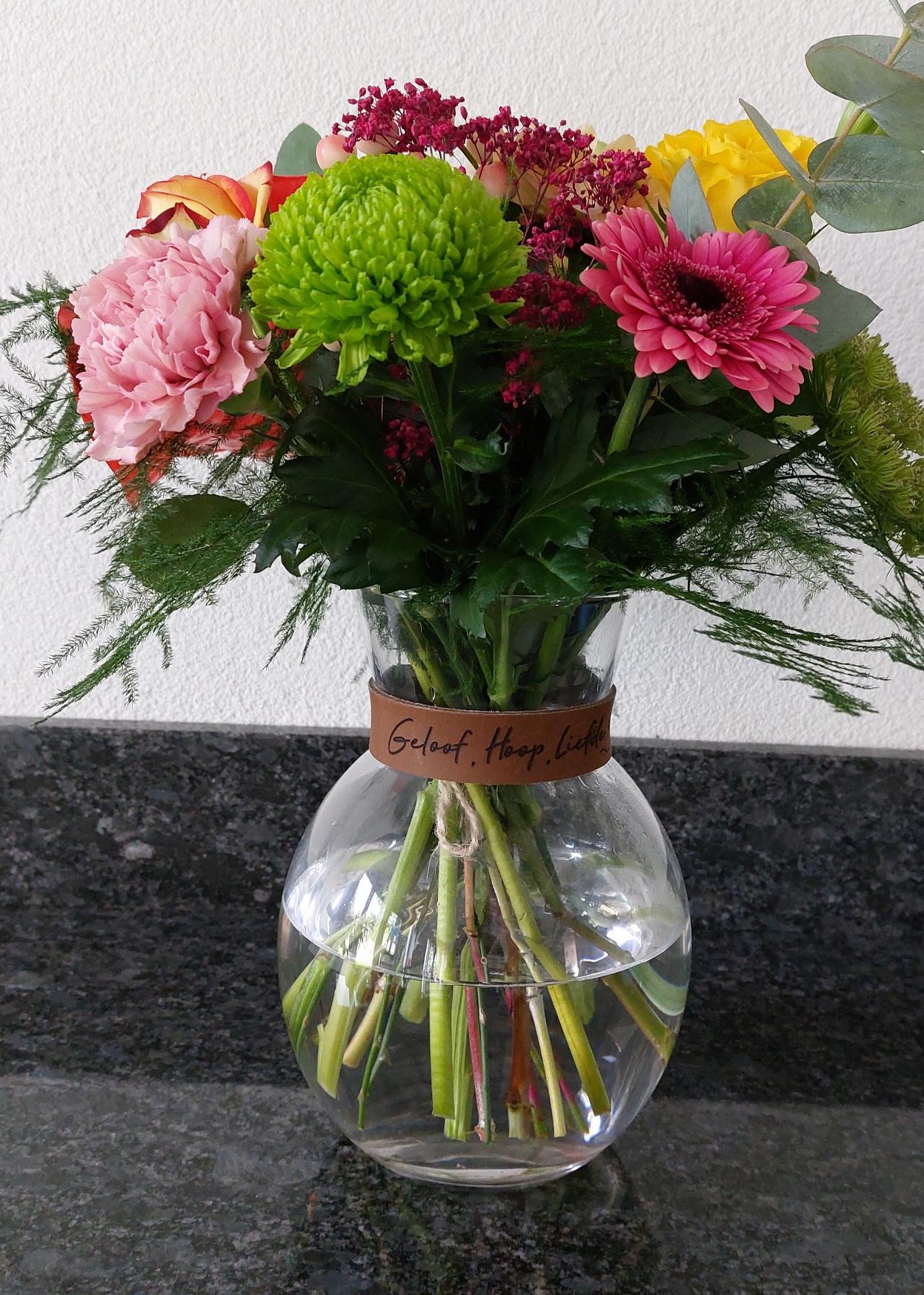 Hoge Vaas met leren band: Geloof, hoop en heel veel liefde