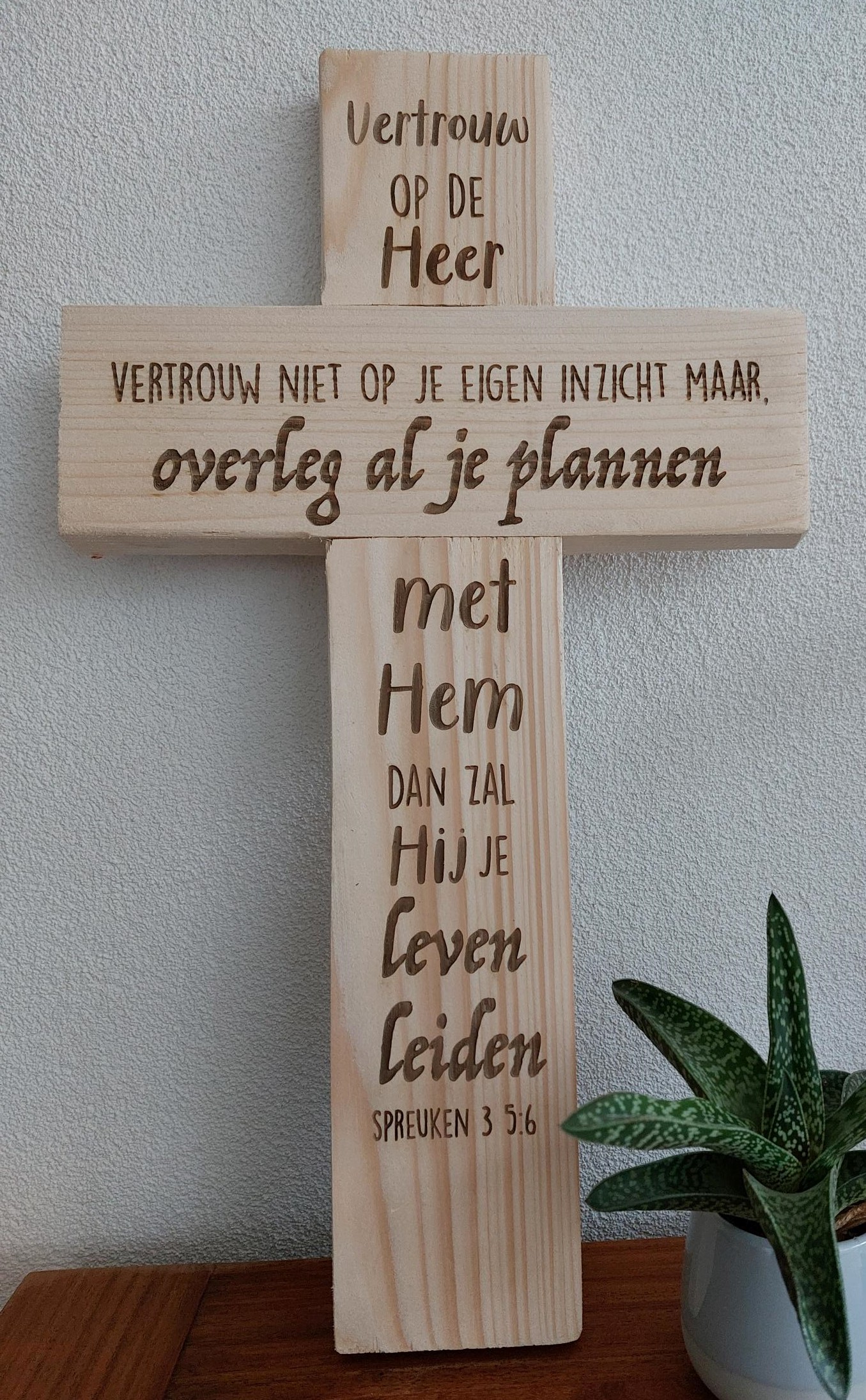 Over de hele lengte en breedte van het kruis staat een tekst: Vertouw op de Heer.. Dit product wordt mede mogelijk gemaakt door mensen met een afstand tot de arbeidsmarkt.