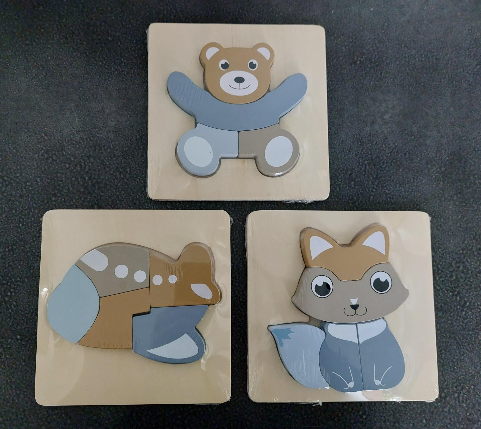 Set van 3 leuke pastel inlegpuzzels 5 stukjes van vliegtuig, vosje en een beertje! Gegarandeerd uren speelplezier voor elke peuter! LET OP: Consumentadviesprijs per stuk € 4,95