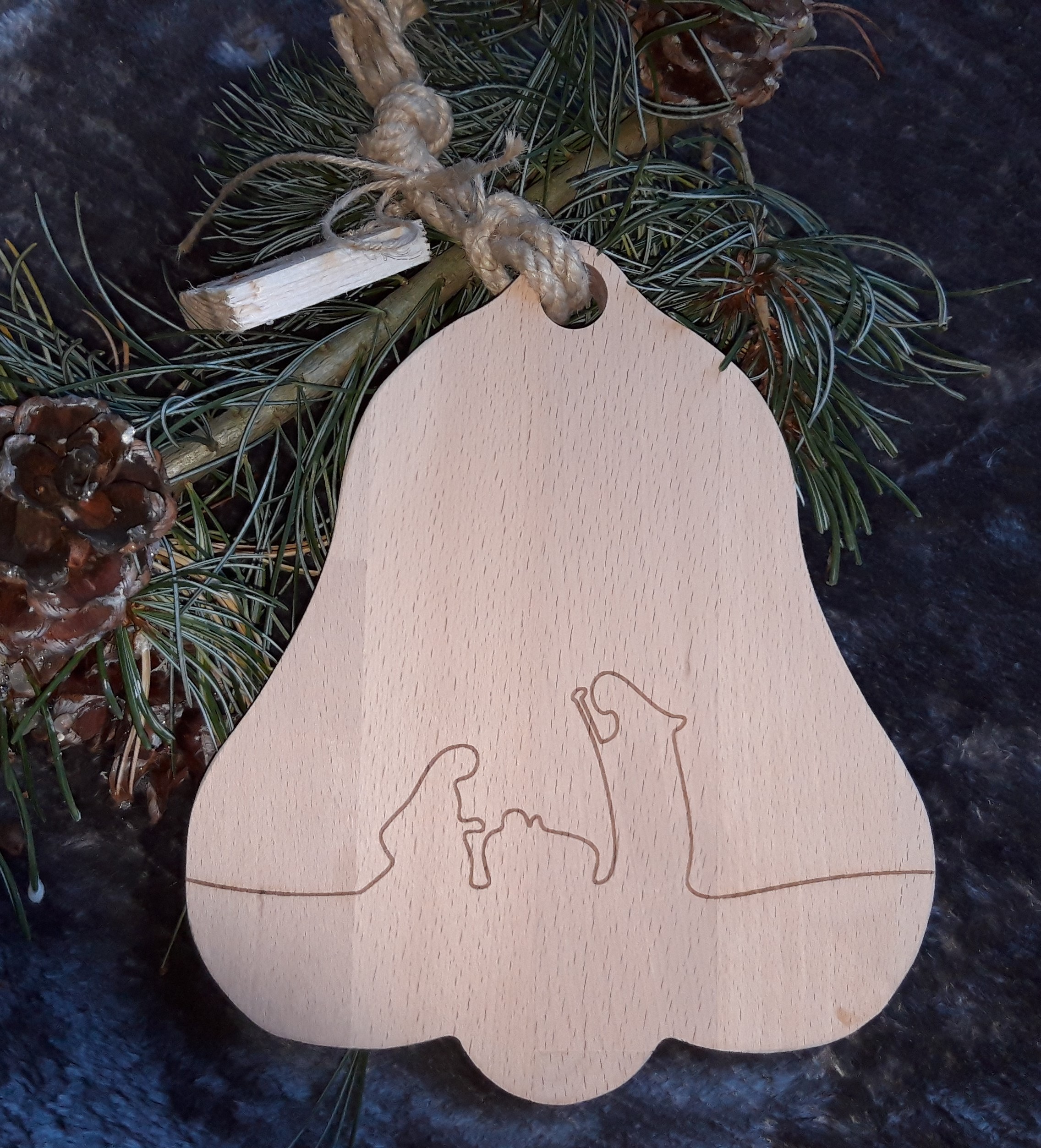 Houten kerkklok met afbeelding van de stal. Handgemaakt door mensen die begeleid worden in onze samenleving. Incl. robuust touw. Gemaakt met een Hart.