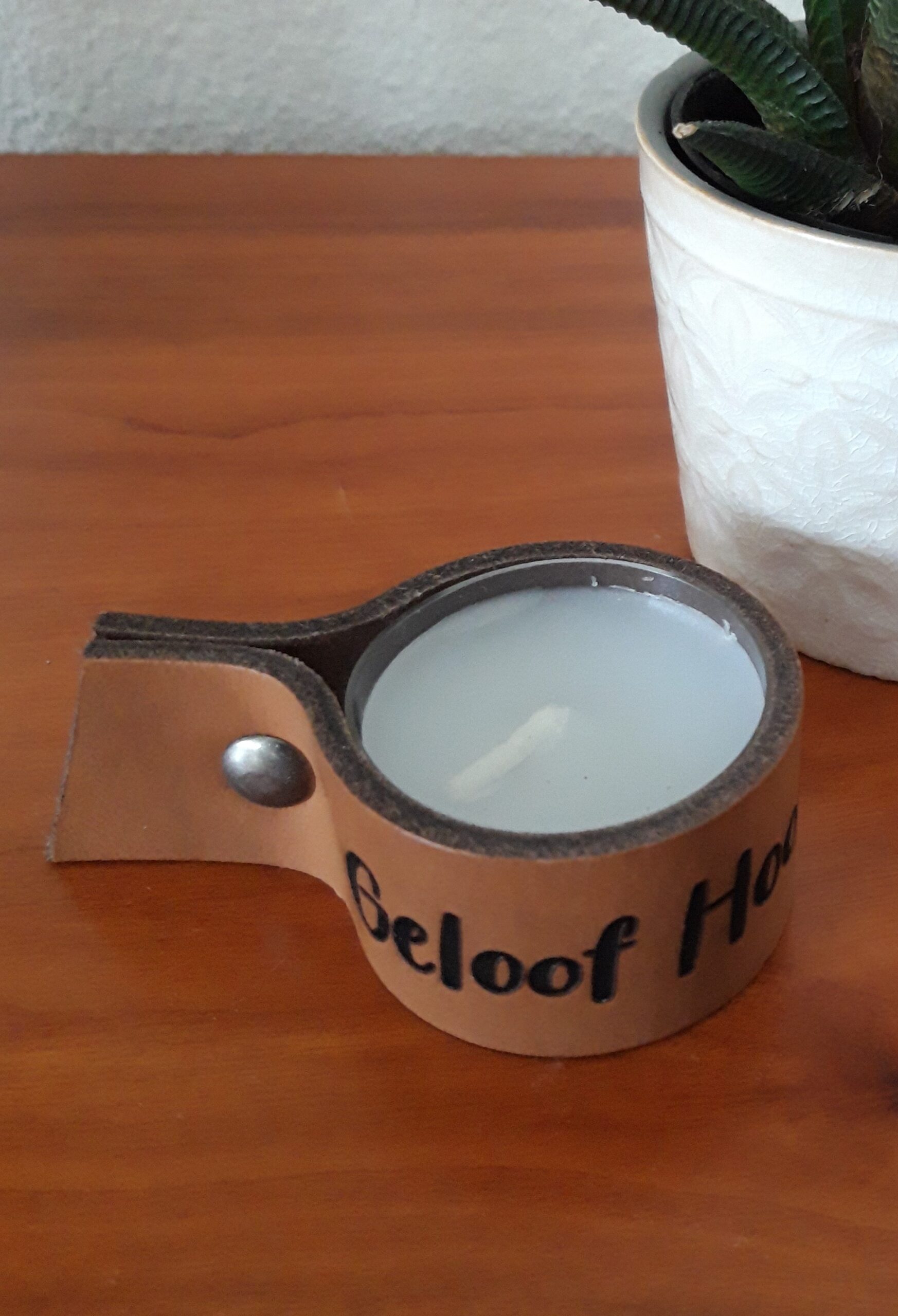 Leren waxinelichtjeshouder bruin met tekst Geloof, Hoop, Liefde. Hervulbaar voor oneidige sfeer in je huis! LET OP! Prijs is per stuk € 4,95 – minimale afname voor winkel is set van 4 stuks