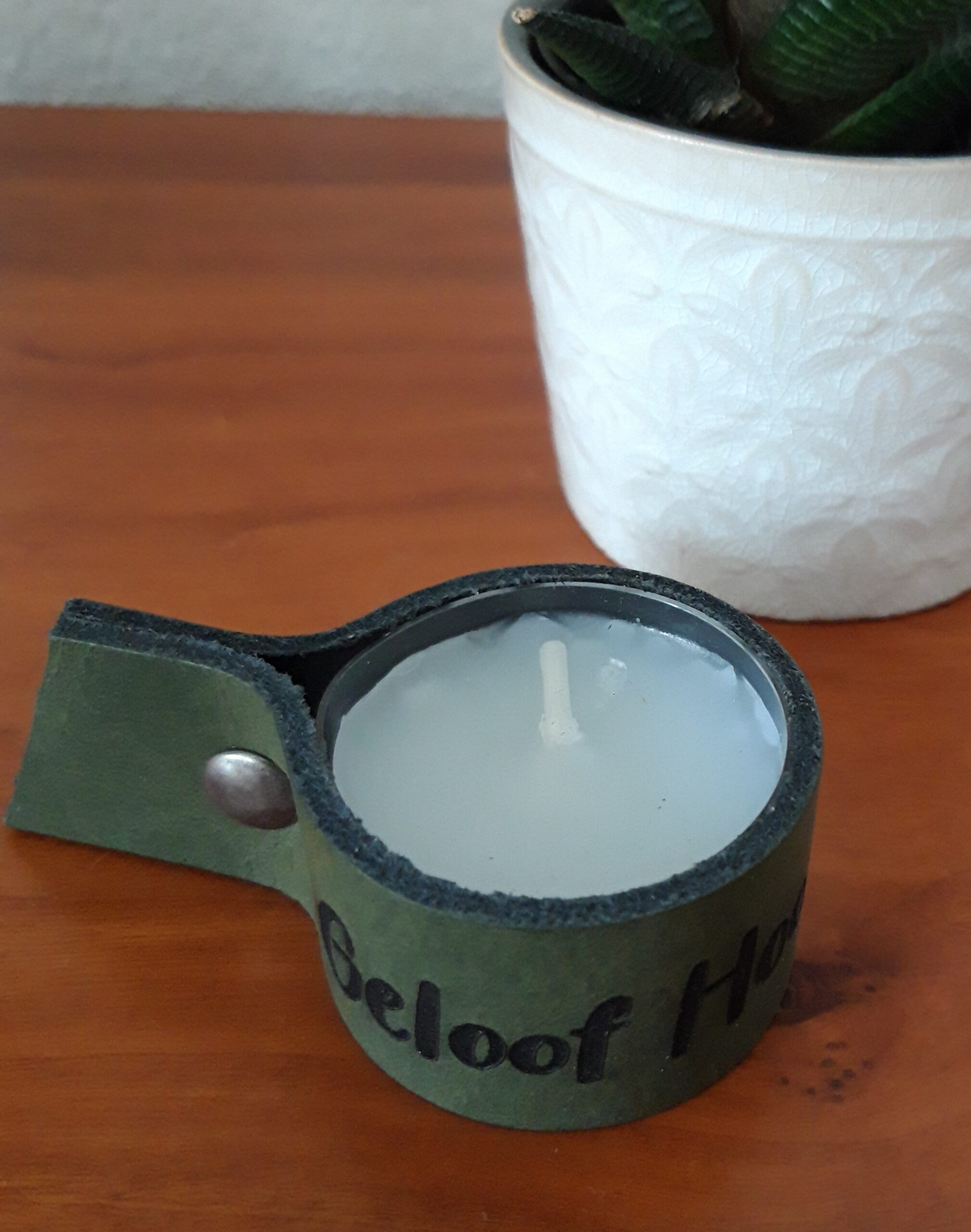 Leren waxinelichtjeshouder groen met tekst Geloof, Hoop, Liefde. Hervulbaar voor oneidige sfeer in je huis! LET OP! Prijs is per stuk € 4,95 – minimale afname voor winkel is set van 4 stuks