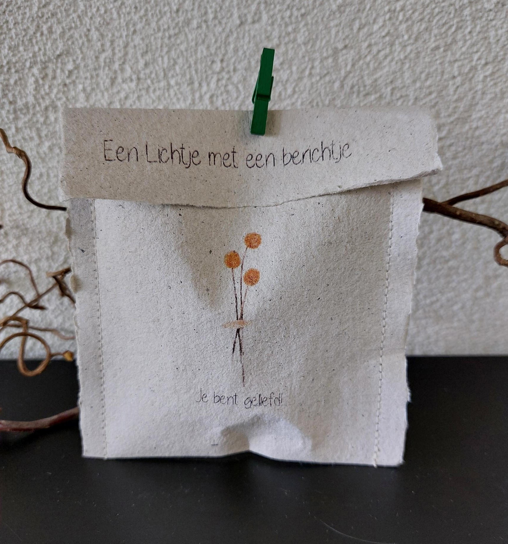 Een prachtig cadeau van handgeschept papier (oud Hollands). Dit cadeau van handgeschept papier bevat een uniek cadeaulichtje. ! Ontsteek het cadeaulichtje en de boodschap wordt langzaam zichtbaar! Dit product is met liefde gemaakt door mensen met een afstand tot de arbeidsmarkt.