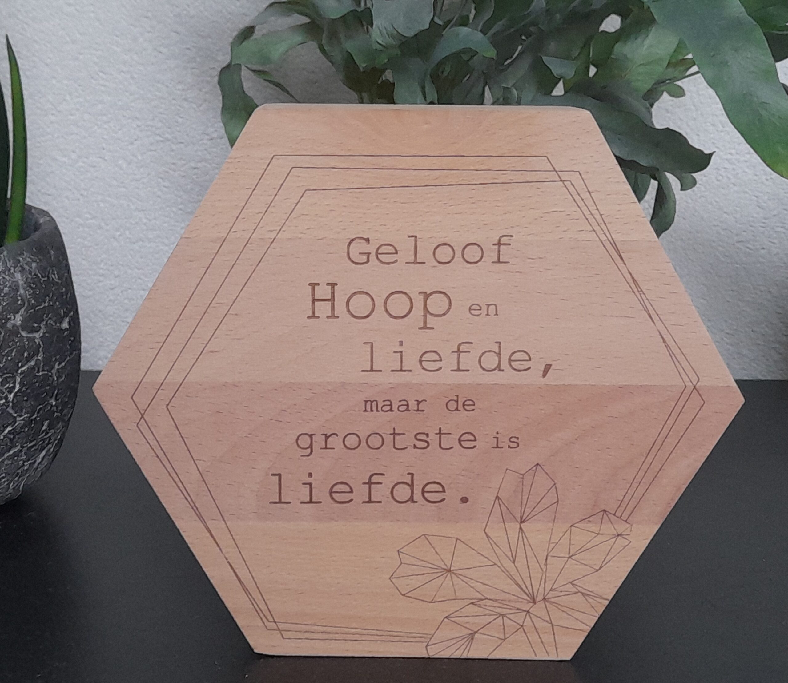 Houten Nordic Honingraat om neer te zetten, voorzien van een prachtige tekst en artwork. Handgemaakt door mensen die begeleid worden in onze samenleving. Gemaakt met een Hart.