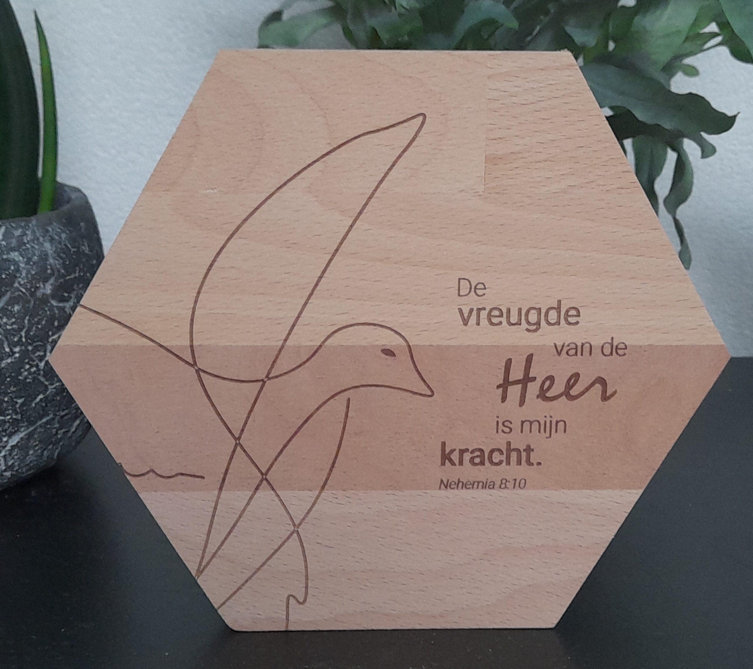 Houten Nordic Honingraat om neer te zetten, voorzien van een prachtige tekst en artwork. Handgemaakt door mensen die begeleid worden in onze samenleving. Gemaakt met een Hart.