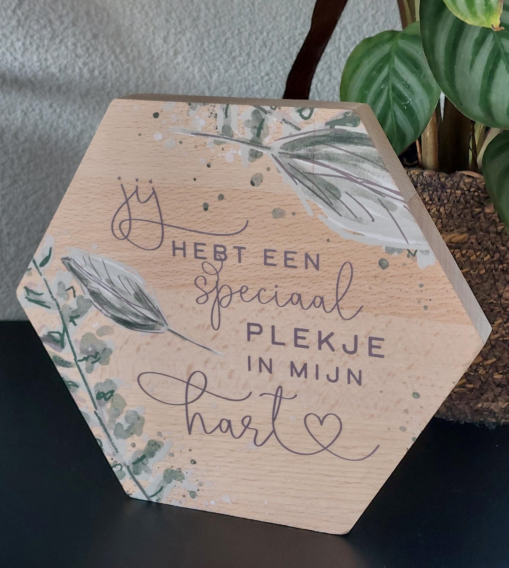 Houten Nordic Honingraat om neer te zetten, voorzien van een prachtige tekst en artwork. Handgemaakt door mensen die begeleid worden in onze samenleving. Gemaakt met een Hart.