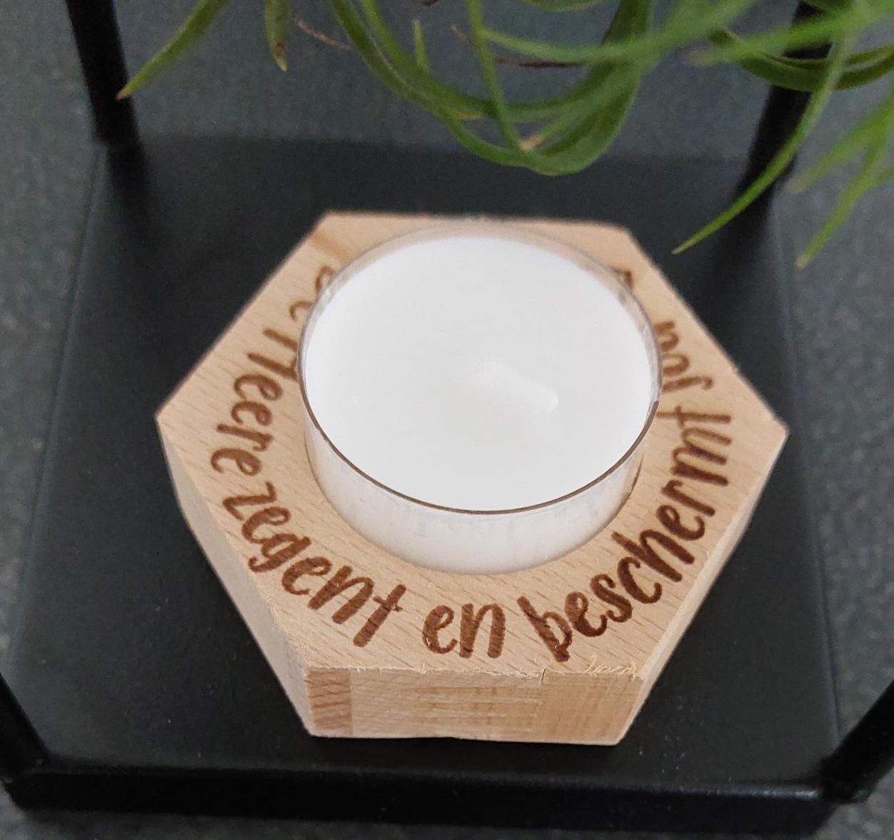 Nordic houder met waxinelichtje. De tekst is in het hout gegraveerd. Hand gemaakt en mede mogelijk gemaakt door mensen met een afstand tot de arbeidsmarkt!