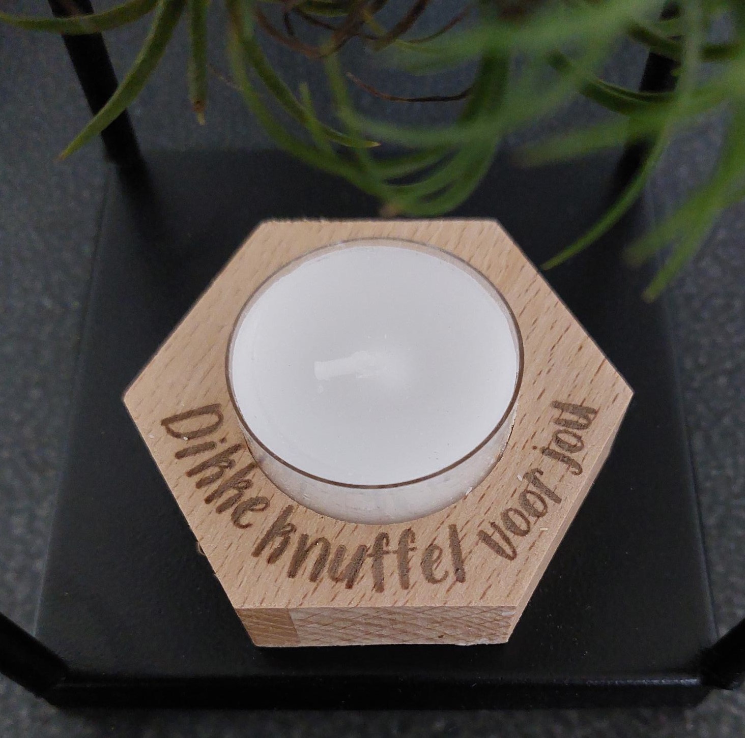 Nordic houder met waxinelichtje. De tekst is in het hout gegraveerd. Hand gemaakt en mede mogelijk gemaakt door mensen met een afstand tot de arbeidsmarkt!