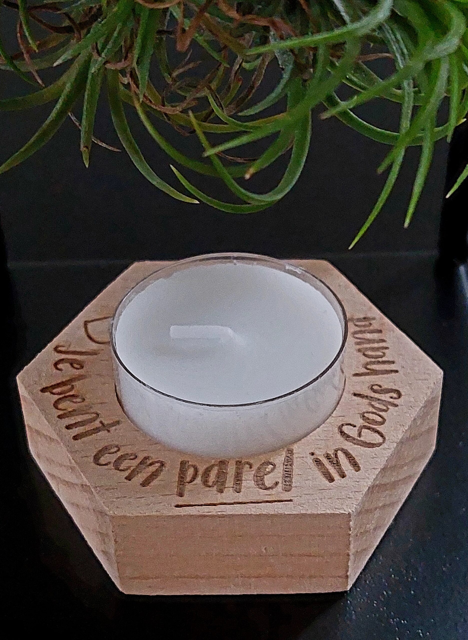 Nordic houder met waxinelichtje. De tekst is in het hout gegraveerd. Hand gemaakt en mede mogelijk gemaakt door mensen met een afstand tot de arbeidsmarkt!