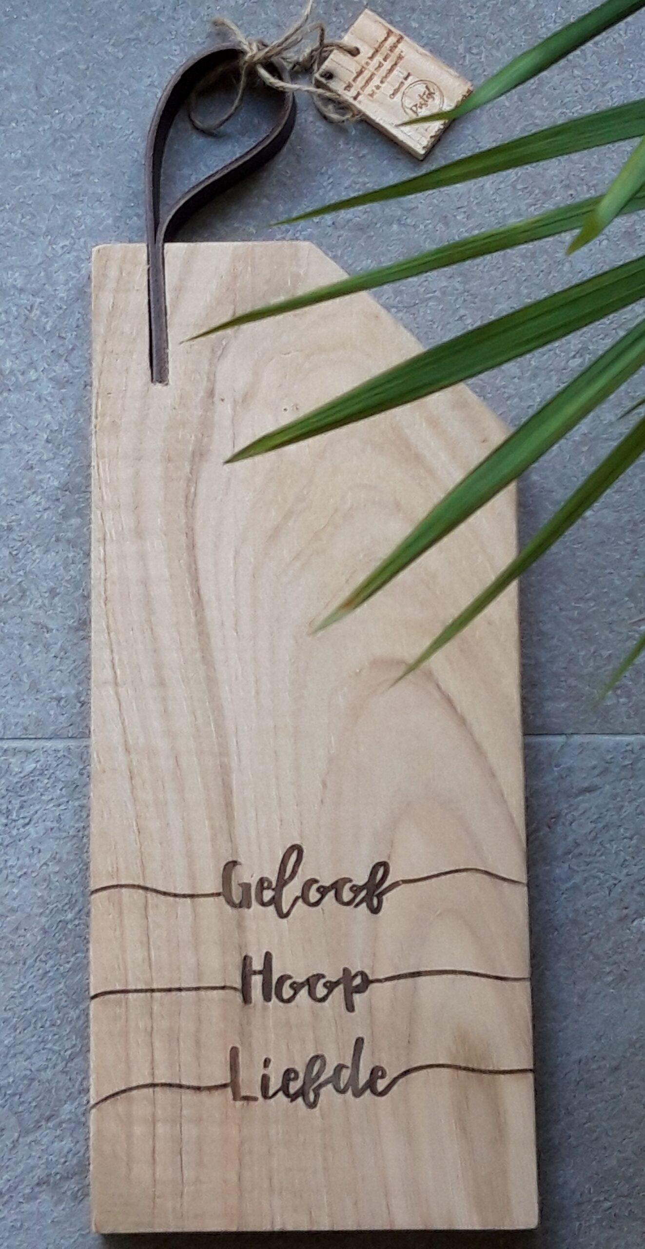 Mooie stevige snijplank met leren lus/handvat, met de tekst “Geloof, Hoop, Liefde”. Gemaakt door mensen met een afstand tot de arbeidsmarkt.