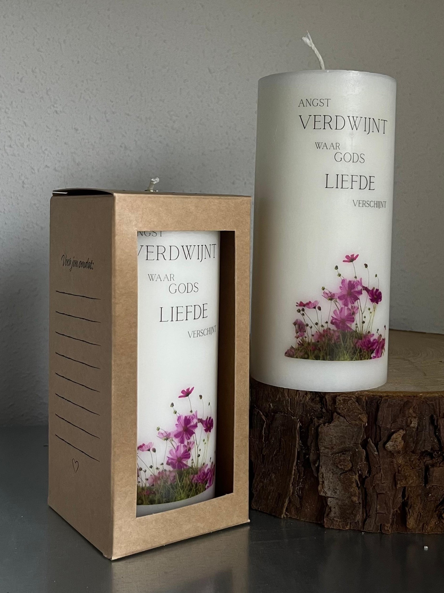 Prachtig bedrukte stompkaars in mooie cadeauverpakking waarop u een persoonlijke boodschap kunt schrijven. Hand gemaakt, Mede mogelijk gemaakt door mensen met een afstand tot de arbeidsmarkt, Vervaardigd uit natuurlijke grondstoffen, Vrij van parrafine en metalen, Duurzame verbranding, Ongeparfumeerd, Vormvast.