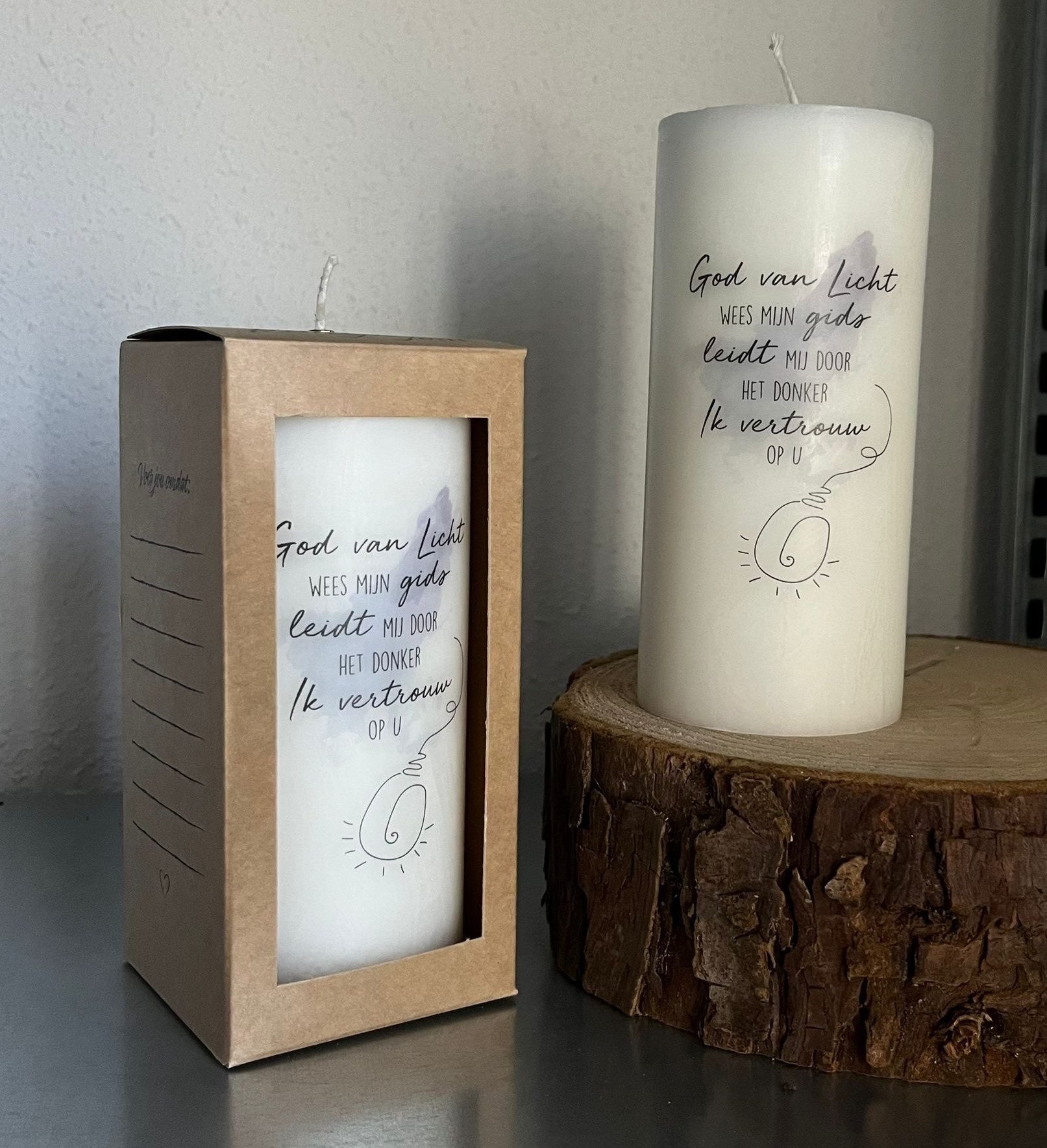 Prachtig bedrukte stompkaars in mooie cadeauverpakking waarop u een persoonlijke boodschap kunt schrijven. Hand gemaakt, Mede mogelijk gemaakt door mensen met een afstand tot de arbeidsmarkt, Vervaardigd uit natuurlijke grondstoffen, Vrij van parrafine en metalen, Duurzame verbranding, Ongeparfumeerd, Vormvast.