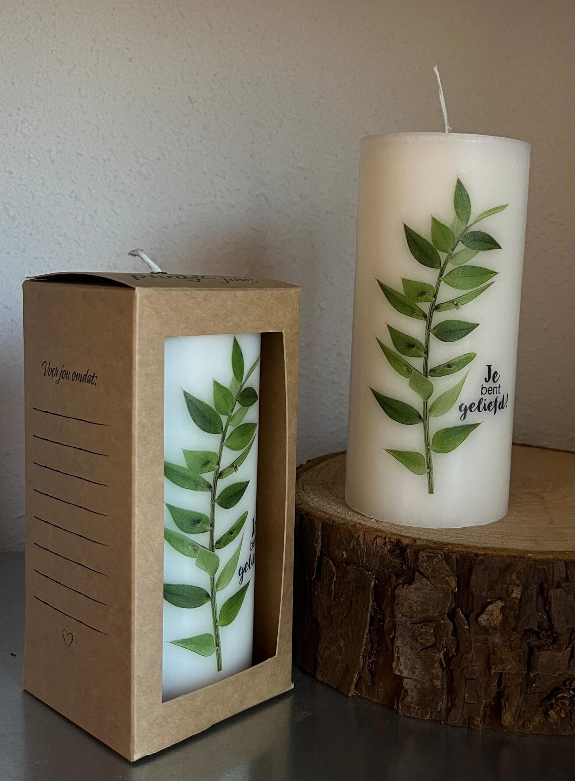 Prachtig bedrukte stompkaars in mooie cadeauverpakking waarop u een persoonlijke boodschap kunt schrijven. Hand gemaakt, Mede mogelijk gemaakt door mensen met een afstand tot de arbeidsmarkt, Vervaardigd uit natuurlijke grondstoffen, Vrij van parrafine en metalen, Duurzame verbranding, Ongeparfumeerd, Vormvast.