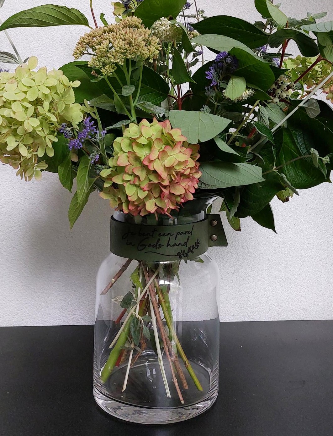 Prachtige bloemenvaas met leerband. Mede gemaakt door mensen met een achterstand op de arbeidsmarkt. Deze vaas wordt geleverd exclusief inhoud.