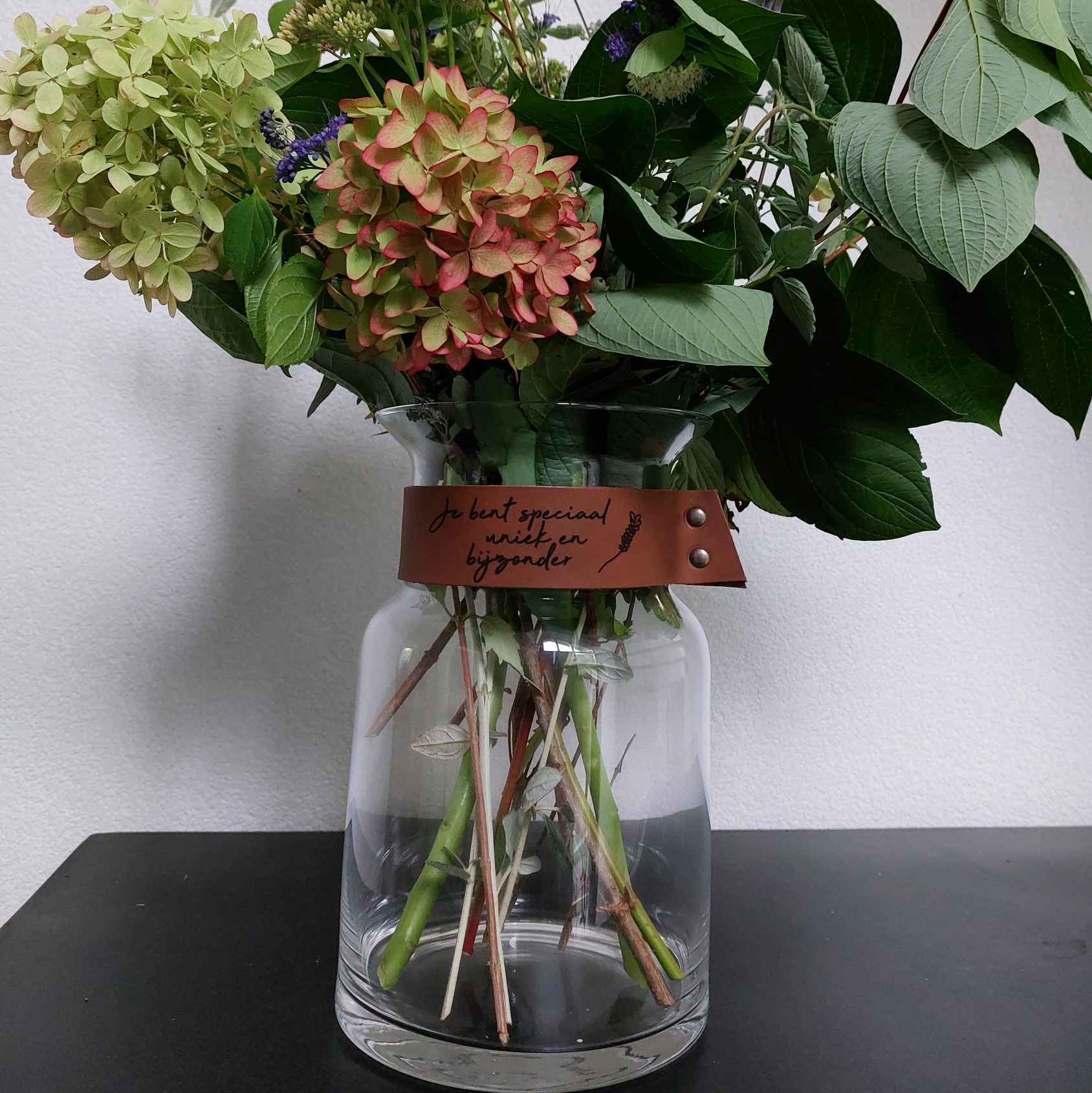 Prachtige bloemenvaas met leerband. Mede gemaakt door mensen met een achterstand op de arbeidsmarkt. Deze vaas wordt geleverd exclusief inhoud.