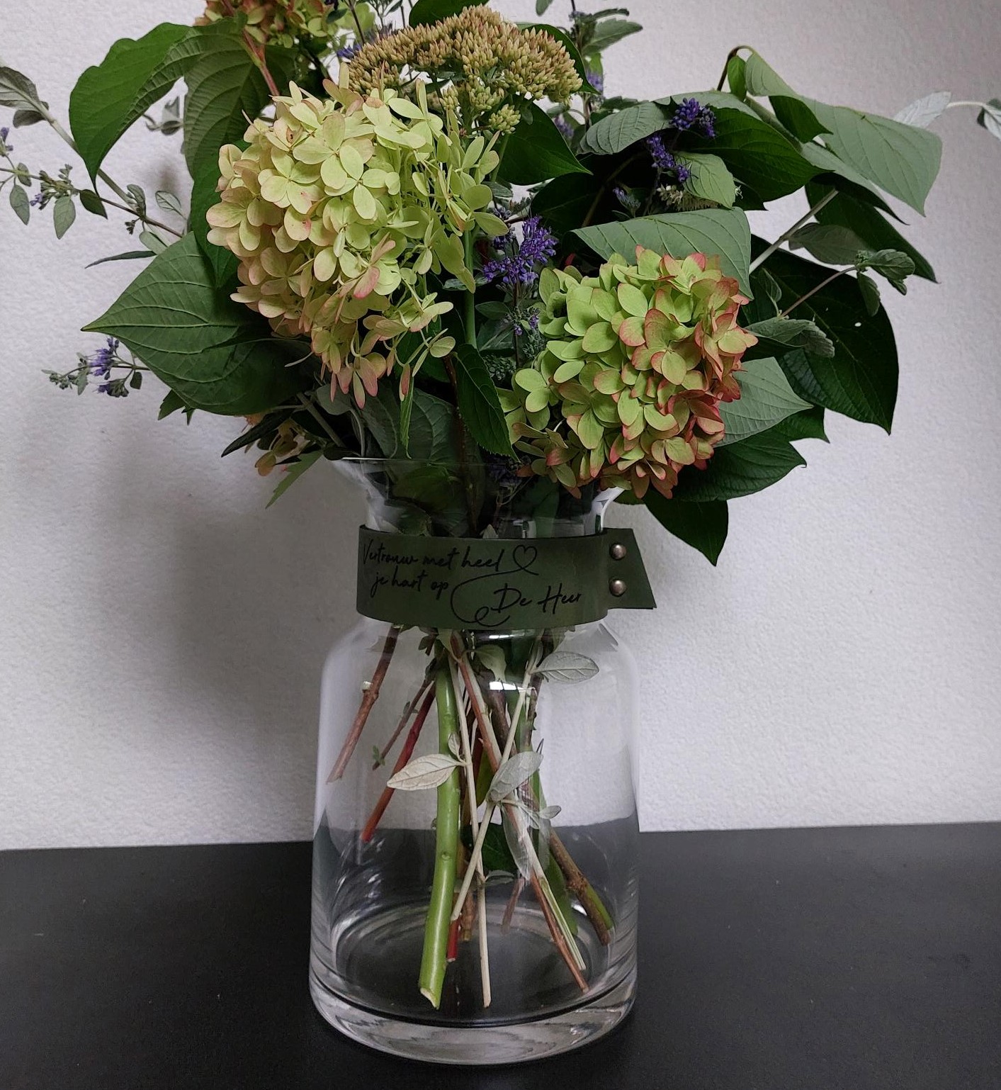 Prachtige bloemenvaas met leerband. Mede gemaakt door mensen met een achterstand op de arbeidsmarkt. Deze vaas wordt geleverd exclusief inhoud.