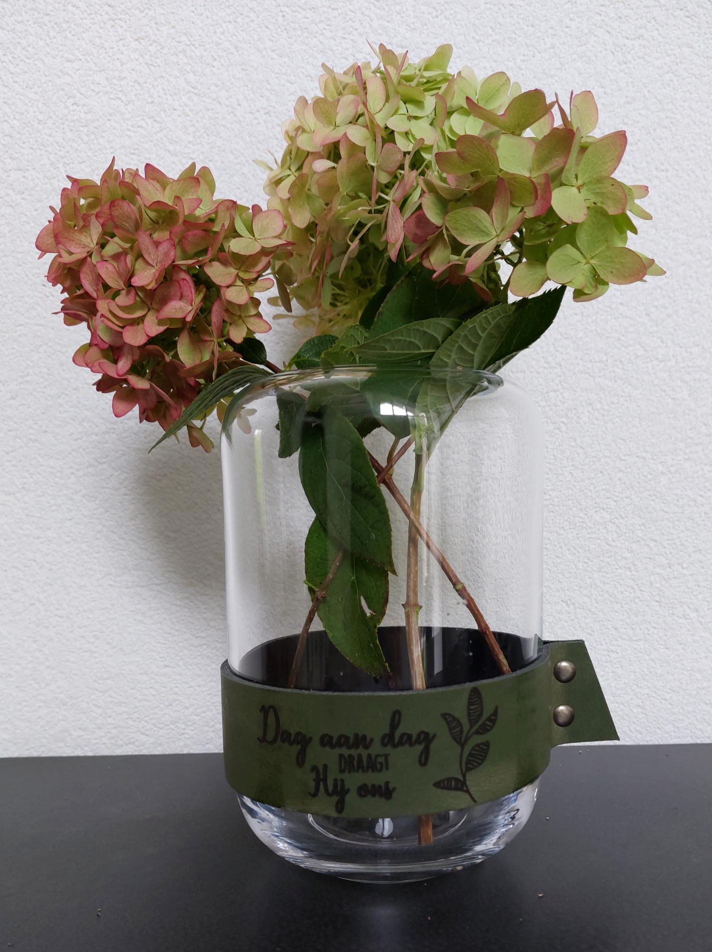 Prachtige bloemenvaas met leerband. Mede gemaakt door mensen met een achterstand op de arbeidsmarkt. Deze vaas wordt geleverd exclusief inhoud.