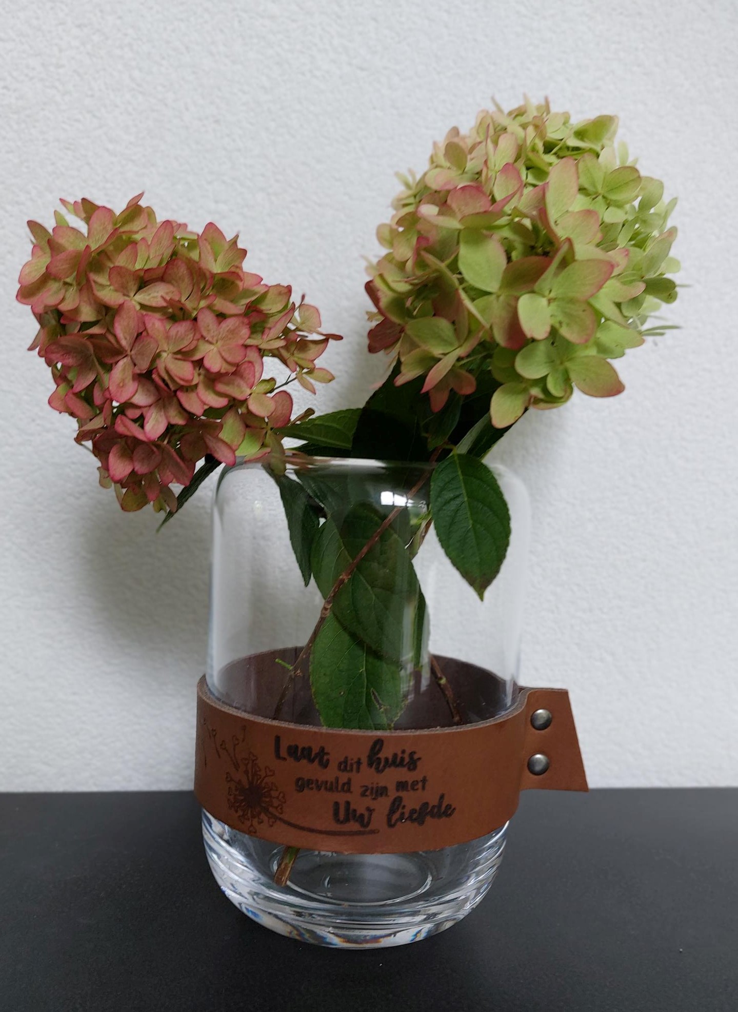 Prachtige bloemenvaas met leerband. Mede gemaakt door mensen met een achterstand op de arbeidsmarkt. Deze vaas wordt geleverd exclusief inhoud.